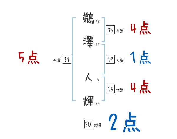 総運![]() | 鵜澤人輝さんの総運は50画の2つ星!浮き沈みが激しく不安定。しりすぼみに衰退しやすいので注意しましょう。 あなたの人生を表す1番重要な運勢です。生涯を通じて影響する総合運となり、主に50歳以降の晩年期に影響を及ぼします。 |