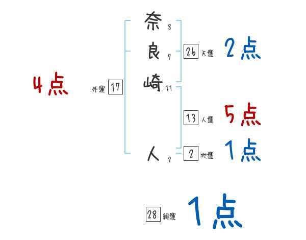 外運![]() | 奈良崎人さんの外運は17画の4つ星!積極的な行動力。地位を気づき財産を手に入れる。純粋な心と直感力。 生活面を象徴する運勢です。外部から受ける影響力を表し、結婚運、家庭運や職場、環境への順応性を表します。 |