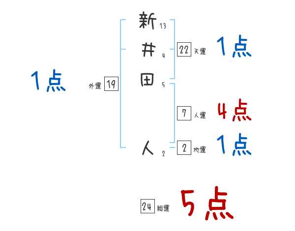 天運![]() | 新井田人さんの天運は22画の1つ星!努力することが苦手ないっぽう手先が器用。芸術性にも優れる。 家系が持つ宿命的な運勢を表します。祖先から受け継いだ苗字ですので自分の力が及びません。家柄を象徴します。 |