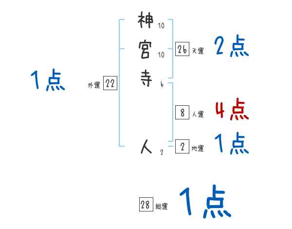 総運![]() | 神宮寺人さんの総運は28画の1つ星!家庭環境に注意。スポーツで活躍できる能力があるかも。 あなたの人生を表す1番重要な運勢です。生涯を通じて影響する総合運となり、主に50歳以降の晩年期に影響を及ぼします。 |