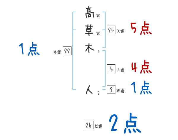 天運![]() | 高草木人さんの天運は24画の5つ星!家庭運が良く順調な人生。金運にも恵まれる。 家系が持つ宿命的な運勢を表します。祖先から受け継いだ苗字ですので自分の力が及びません。家柄を象徴します。 |