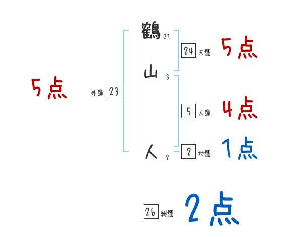 天運![]() | 鶴山人さんの天運は24画の5つ星!家庭運が良く順調な人生。金運にも恵まれる。 家系が持つ宿命的な運勢を表します。祖先から受け継いだ苗字ですので自分の力が及びません。家柄を象徴します。 |