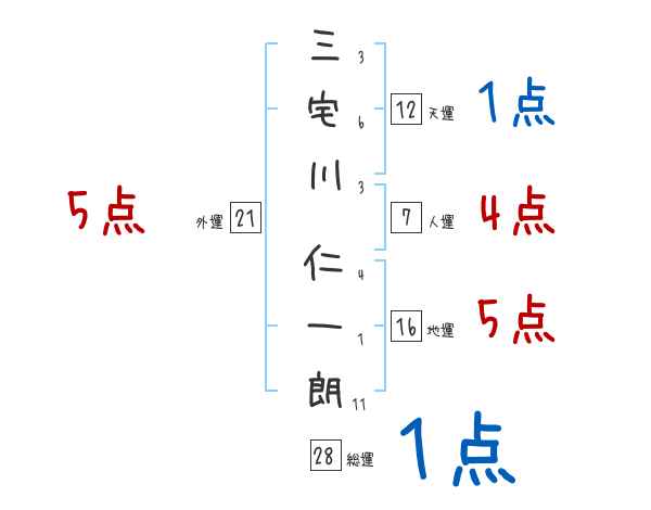 地運![]() | 三宅川仁一朗さんの地運は16画の5つ星!人望が厚く大きく発展する。逆転成功が見える。 個性を表す基礎的な運勢です。性格形成や対人関係、行動力など家庭環境に影響されます。主に誕生してから20歳くらいまでの若年期の運勢を表します。 |