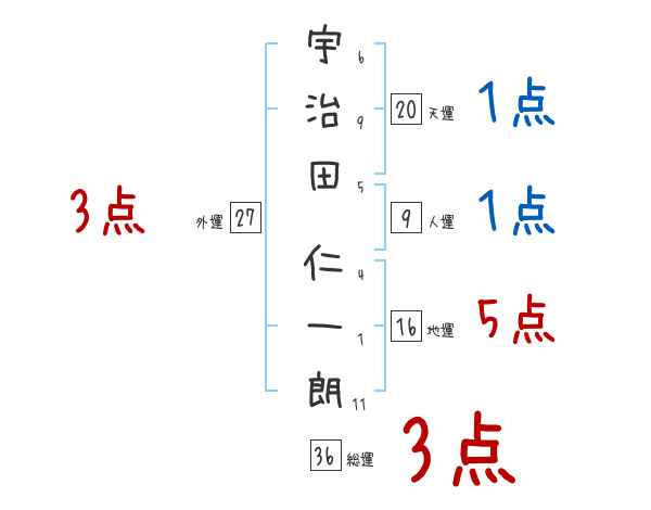 総運![]() | 宇治田仁一朗さんの総運は36画の3つ星!先見性が豊かです。多少神経質で苦労することも。 あなたの人生を表す1番重要な運勢です。生涯を通じて影響する総合運となり、主に50歳以降の晩年期に影響を及ぼします。 |