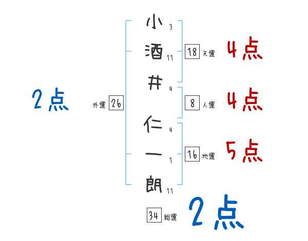 外運![]() | 小酒井仁一朗さんの外運は26画の2つ星!波瀾万丈かも。信頼できる人を大事にしましょう。 生活面を象徴する運勢です。外部から受ける影響力を表し、結婚運、家庭運や職場、環境への順応性を表します。 |