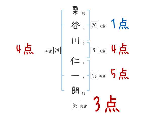 総運![]() | 栗谷川仁一朗さんの総運は36画の3つ星!先見性が豊かです。多少神経質で苦労することも。 あなたの人生を表す1番重要な運勢です。生涯を通じて影響する総合運となり、主に50歳以降の晩年期に影響を及ぼします。 |