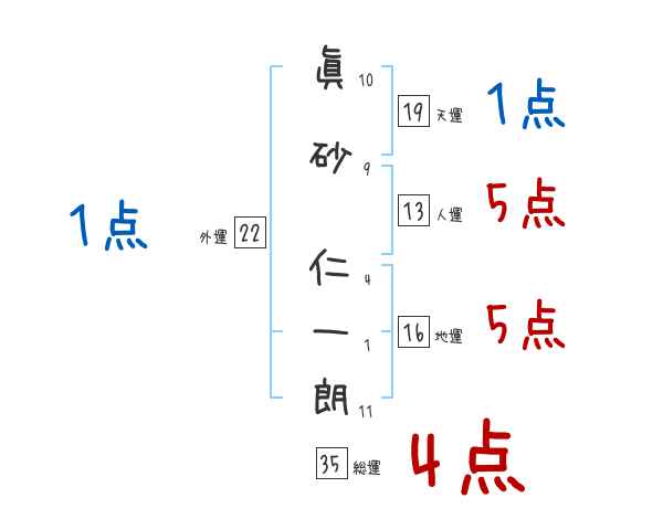人運![]() | 眞砂仁一朗さんの人運は13画の5つ星!才能に恵まれ人気がある。名声を手に入れる。円満な人生。 性格や才能などを表す2番目に重要な運勢です。人間関係や協調性、社会的な成功に影響します。主に20歳から50歳ぐらいまでの中年期の運勢を表します。 |