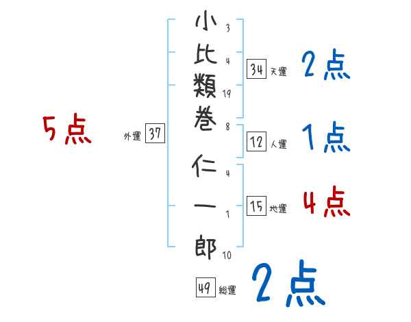 外運![]() | 小比類巻仁一郎さんの外運は37画の5つ星!努力家で順応性に優れる。現実的な考え方ができ忠実に物事をこなす。 生活面を象徴する運勢です。外部から受ける影響力を表し、結婚運、家庭運や職場、環境への順応性を表します。 |