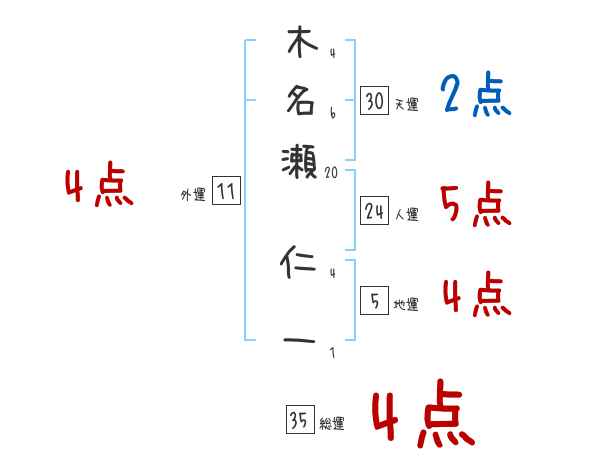 総運![]() | 木名瀬仁一さんの総運は35画の4つ星!温厚な性格で感受性が高い。穏和な性格で人望が厚い。 あなたの人生を表す1番重要な運勢です。生涯を通じて影響する総合運となり、主に50歳以降の晩年期に影響を及ぼします。 |