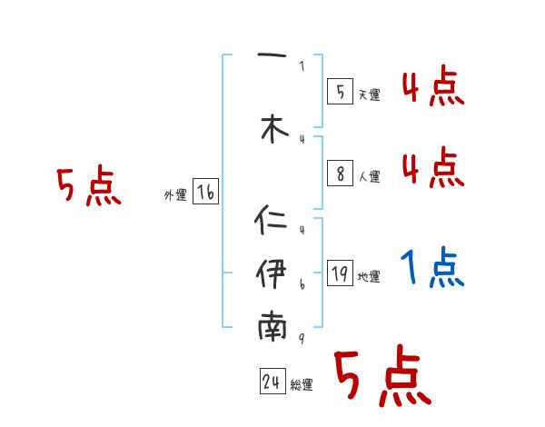 天運![]() | 一木仁伊南さんの天運は5画の4つ星!健康で安泰。協調性に優れ、財産に恵まれる。 家系が持つ宿命的な運勢を表します。祖先から受け継いだ苗字ですので自分の力が及びません。家柄を象徴します。 |