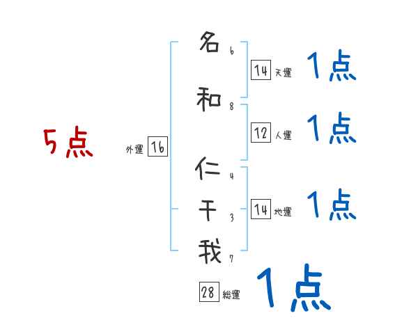 外運![]() | 名和仁千我さんの外運は16画の5つ星!人望が厚く大きく発展する。逆転成功が見える。 生活面を象徴する運勢です。外部から受ける影響力を表し、結婚運、家庭運や職場、環境への順応性を表します。 |