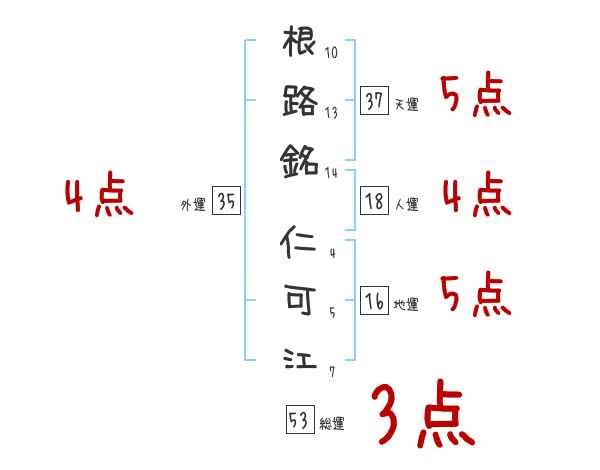 総運![]() | 根路銘仁可江さんの総運は53画の3つ星!やや見栄っ張りで虚栄心がある。散財に注意。 あなたの人生を表す1番重要な運勢です。生涯を通じて影響する総合運となり、主に50歳以降の晩年期に影響を及ぼします。 |