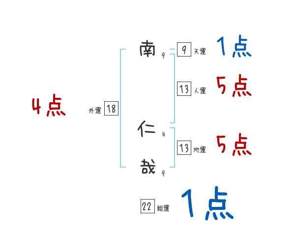 天運![]() | 南仁哉さんの天運は9画の1つ星!消極的で才能を発揮することが苦手なことも。周りの意見に耳を傾けましょう。 家系が持つ宿命的な運勢を表します。祖先から受け継いだ苗字ですので自分の力が及びません。家柄を象徴します。 |