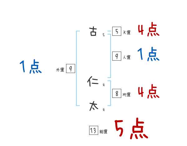 天運![]() | 古仁太さんの天運は5画の4つ星!健康で安泰。協調性に優れ、財産に恵まれる。 家系が持つ宿命的な運勢を表します。祖先から受け継いだ苗字ですので自分の力が及びません。家柄を象徴します。 |