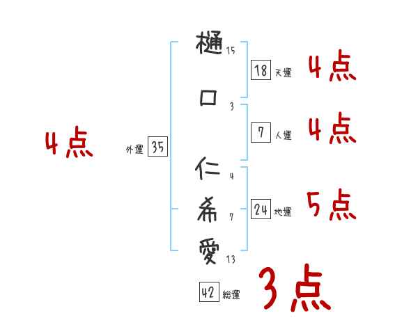 外運![]() | 樋口仁希愛さんの外運は35画の4つ星!温厚な性格で感受性が高い。穏和な性格で人望が厚い。 生活面を象徴する運勢です。外部から受ける影響力を表し、結婚運、家庭運や職場、環境への順応性を表します。 |