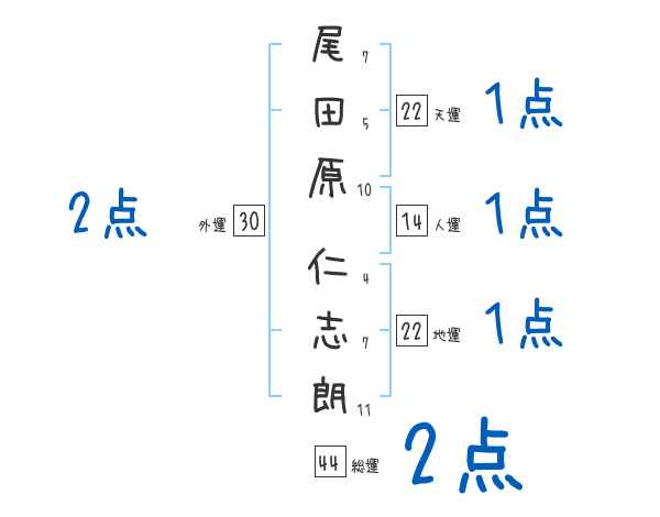 総運![]() | 尾田原仁志朗さんの総運は44画の2つ星!誠実で慎重な性格。物事を考えすぎないように注意しましょう。 あなたの人生を表す1番重要な運勢です。生涯を通じて影響する総合運となり、主に50歳以降の晩年期に影響を及ぼします。 |
