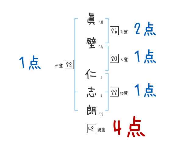 外運![]() | 眞壁仁志朗さんの外運は28画の1つ星!家庭環境に注意。スポーツで活躍できる能力があるかも。 生活面を象徴する運勢です。外部から受ける影響力を表し、結婚運、家庭運や職場、環境への順応性を表します。 |