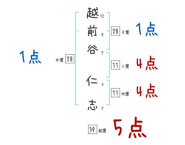 天運![]() | 越前谷仁志さんの天運は28画の1つ星!家庭環境に注意。スポーツで活躍できる能力があるかも。 家系が持つ宿命的な運勢を表します。祖先から受け継いだ苗字ですので自分の力が及びません。家柄を象徴します。 |