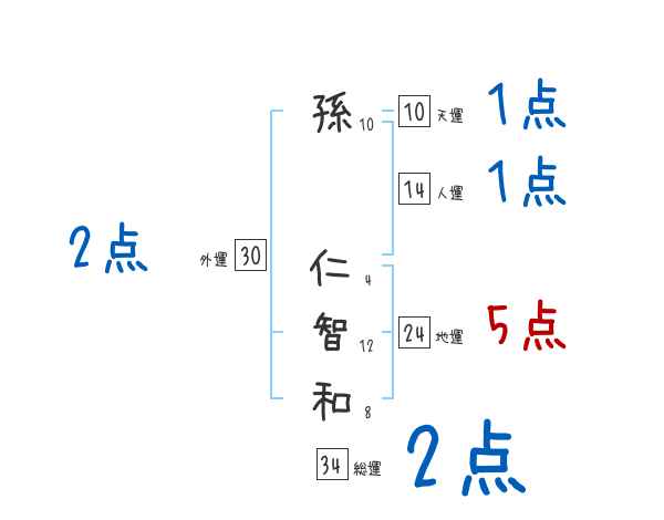総運![]() | 孫仁智和さんの総運は34画の2つ星!独創性に優れるが、自尊心が強く災難に注意しましょう。 あなたの人生を表す1番重要な運勢です。生涯を通じて影響する総合運となり、主に50歳以降の晩年期に影響を及ぼします。 |