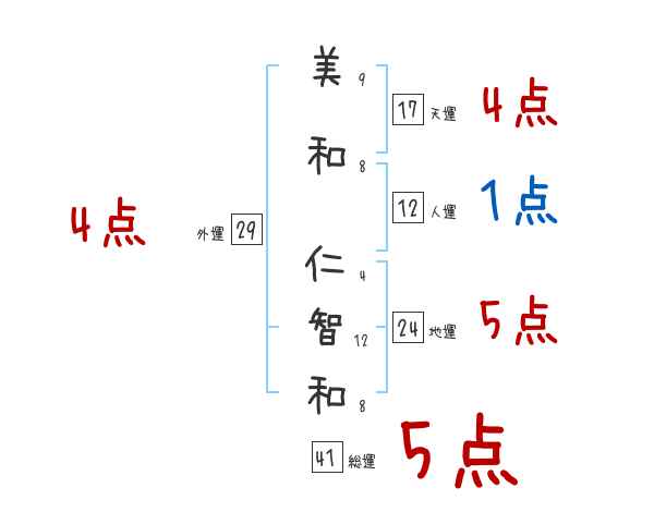 外運![]() | 美和仁智和さんの外運は29画の4つ星!完全主義で才能がある。厳格な心の持ち主。 生活面を象徴する運勢です。外部から受ける影響力を表し、結婚運、家庭運や職場、環境への順応性を表します。 |
