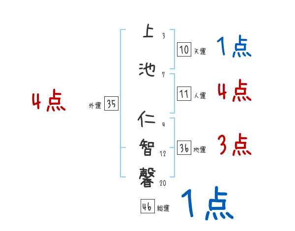天運![]() | 上池仁智馨さんの天運は10画の1つ星!不安を感じやすい傾向。ストレスを抱えないように注意しましょう。 家系が持つ宿命的な運勢を表します。祖先から受け継いだ苗字ですので自分の力が及びません。家柄を象徴します。 |