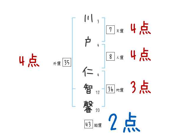 天運![]() | 川戸仁智馨さんの天運は7画の4つ星!強い意志や信念を持ち独立心が強い。自立する。 家系が持つ宿命的な運勢を表します。祖先から受け継いだ苗字ですので自分の力が及びません。家柄を象徴します。 |