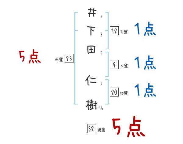 総運![]() | 井下田仁樹さんの総運は32画の5つ星!柔軟性があり成功する。チャンスが多く金運が良い。 あなたの人生を表す1番重要な運勢です。生涯を通じて影響する総合運となり、主に50歳以降の晩年期に影響を及ぼします。 |