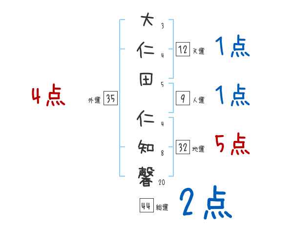 総運![]() | 大仁田仁知馨さんの総運は44画の2つ星!誠実で慎重な性格。物事を考えすぎないように注意しましょう。 あなたの人生を表す1番重要な運勢です。生涯を通じて影響する総合運となり、主に50歳以降の晩年期に影響を及ぼします。 |