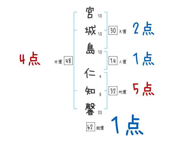 天運![]() | 宮城島仁知馨さんの天運は30画の2つ星!浮き沈みの激しさに注意しましょう。 家系が持つ宿命的な運勢を表します。祖先から受け継いだ苗字ですので自分の力が及びません。家柄を象徴します。 |