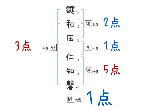 天運![]() | 鍵和田仁知馨さんの天運は30画の2つ星!浮き沈みの激しさに注意しましょう。 家系が持つ宿命的な運勢を表します。祖先から受け継いだ苗字ですので自分の力が及びません。家柄を象徴します。 |