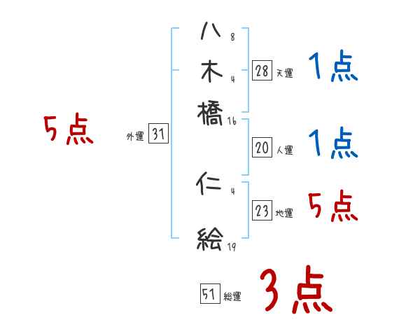天運![]() | 八木橋仁絵さんの天運は28画の1つ星!家庭環境に注意。スポーツで活躍できる能力があるかも。 家系が持つ宿命的な運勢を表します。祖先から受け継いだ苗字ですので自分の力が及びません。家柄を象徴します。 |