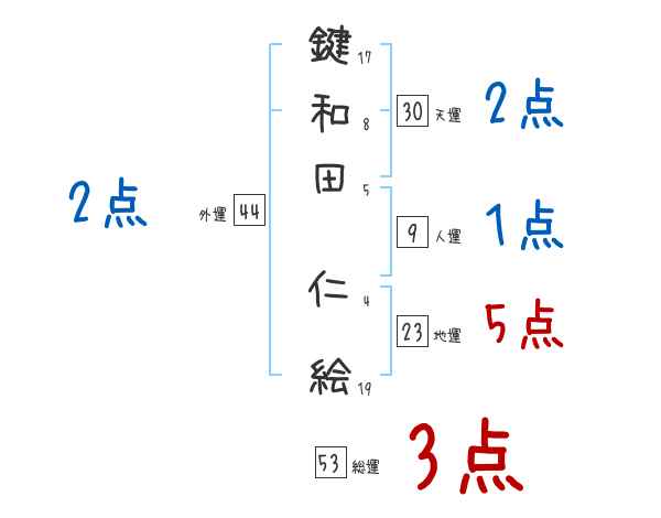 総運![]() | 鍵和田仁絵さんの総運は53画の3つ星!やや見栄っ張りで虚栄心がある。散財に注意。 あなたの人生を表す1番重要な運勢です。生涯を通じて影響する総合運となり、主に50歳以降の晩年期に影響を及ぼします。 |