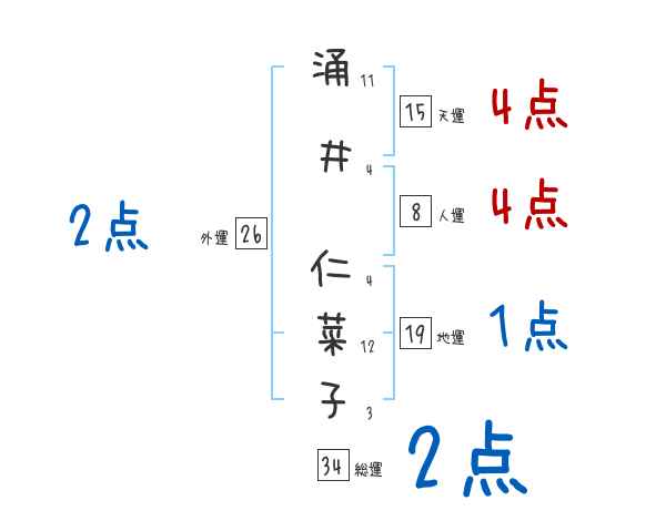 総運![]() | 涌井仁菜子さんの総運は34画の2つ星!独創性に優れるが、自尊心が強く災難に注意しましょう。 あなたの人生を表す1番重要な運勢です。生涯を通じて影響する総合運となり、主に50歳以降の晩年期に影響を及ぼします。 |