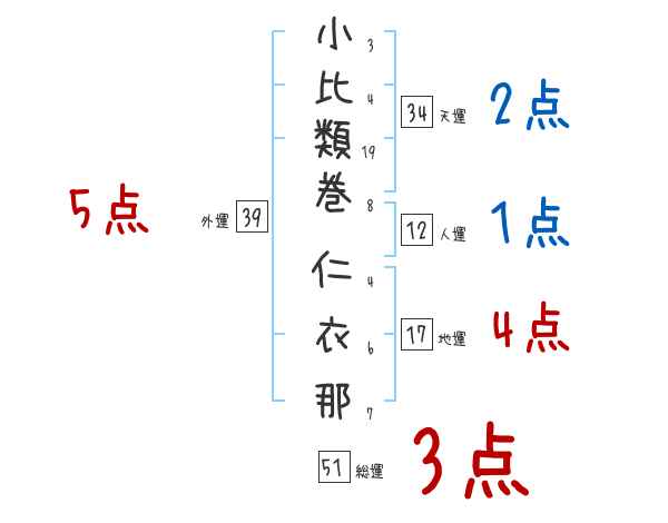 外運![]() | 小比類巻仁衣那さんの外運は39画の5つ星!社交性に優れ人望が厚い。人の上に立ち成功する。 生活面を象徴する運勢です。外部から受ける影響力を表し、結婚運、家庭運や職場、環境への順応性を表します。 |