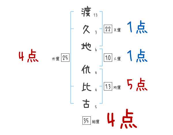 地運![]() | 渡久地仇比古さんの地運は13画の5つ星!才能に恵まれ人気がある。名声を手に入れる。円満な人生。 個性を表す基礎的な運勢です。性格形成や対人関係、行動力など家庭環境に影響されます。主に誕生してから20歳くらいまでの若年期の運勢を表します。 |