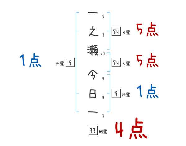 外運![]() | 一之瀬今日一さんの外運は9画の1つ星!消極的で才能を発揮することが苦手なことも。周りの意見に耳を傾けましょう。 生活面を象徴する運勢です。外部から受ける影響力を表し、結婚運、家庭運や職場、環境への順応性を表します。 |