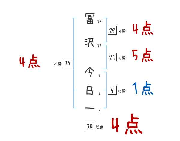 外運![]() | 冨沢今日一さんの外運は17画の4つ星!積極的な行動力。地位を気づき財産を手に入れる。純粋な心と直感力。 生活面を象徴する運勢です。外部から受ける影響力を表し、結婚運、家庭運や職場、環境への順応性を表します。 |