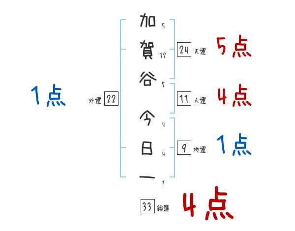 天運![]() | 加賀谷今日一さんの天運は24画の5つ星!家庭運が良く順調な人生。金運にも恵まれる。 家系が持つ宿命的な運勢を表します。祖先から受け継いだ苗字ですので自分の力が及びません。家柄を象徴します。 |