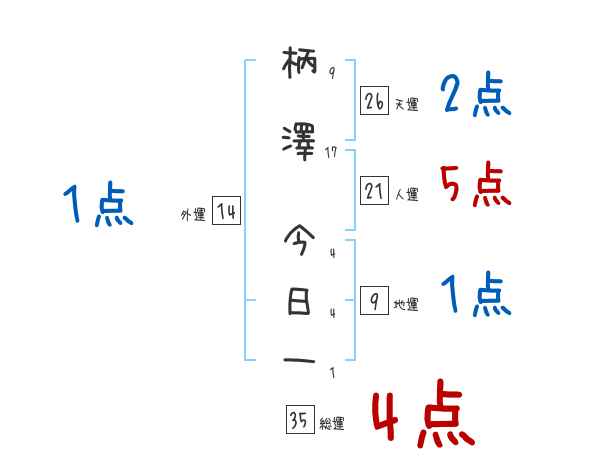 人運![]() | 柄澤今日一さんの人運は21画の5つ星!統率力がある。独立し成功する。名誉を手に入れる。 性格や才能などを表す2番目に重要な運勢です。人間関係や協調性、社会的な成功に影響します。主に20歳から50歳ぐらいまでの中年期の運勢を表します。 |