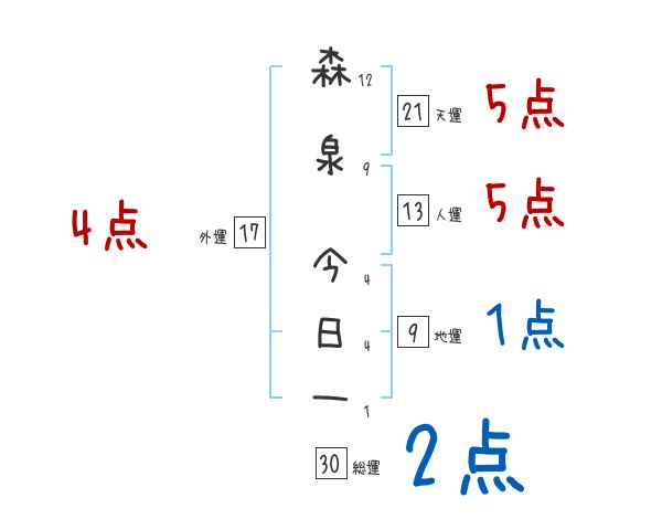 総運![]() | 森泉今日一さんの総運は30画の2つ星!浮き沈みの激しさに注意しましょう。 あなたの人生を表す1番重要な運勢です。生涯を通じて影響する総合運となり、主に50歳以降の晩年期に影響を及ぼします。 |
