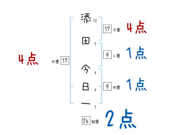 天運![]() | 添田今日一さんの天運は17画の4つ星!積極的な行動力。地位を気づき財産を手に入れる。純粋な心と直感力。 家系が持つ宿命的な運勢を表します。祖先から受け継いだ苗字ですので自分の力が及びません。家柄を象徴します。 |