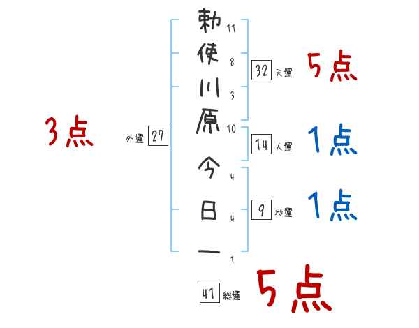 外運![]() | 勅使川原今日一さんの外運は27画の3つ星!頭脳明晰だが強情で摩擦が多い傾向。孤立に注意。 生活面を象徴する運勢です。外部から受ける影響力を表し、結婚運、家庭運や職場、環境への順応性を表します。 |