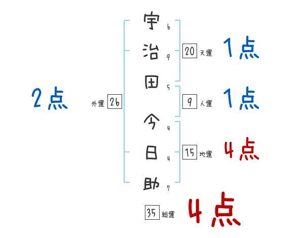 総運![]() | 宇治田今日助さんの総運は35画の4つ星!温厚な性格で感受性が高い。穏和な性格で人望が厚い。 あなたの人生を表す1番重要な運勢です。生涯を通じて影響する総合運となり、主に50歳以降の晩年期に影響を及ぼします。 |