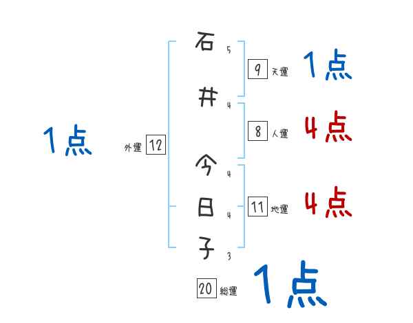 天運![]() | 石井今日子さんの天運は9画の1つ星!消極的で才能を発揮することが苦手なことも。周りの意見に耳を傾けましょう。 家系が持つ宿命的な運勢を表します。祖先から受け継いだ苗字ですので自分の力が及びません。家柄を象徴します。 |