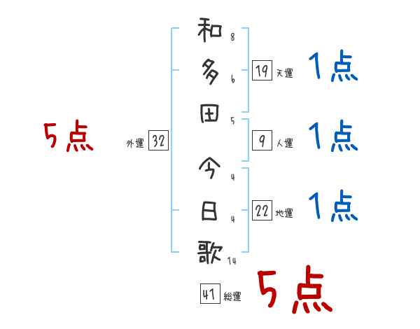 外運![]() | 和多田今日歌さんの外運は32画の5つ星!柔軟性があり成功する。チャンスが多く金運が良い。 生活面を象徴する運勢です。外部から受ける影響力を表し、結婚運、家庭運や職場、環境への順応性を表します。 |