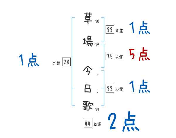 地運![]() | 草場今日歌さんの地運は22画の1つ星!努力することが苦手ないっぽう手先が器用。芸術性にも優れる。 個性を表す基礎的な運勢です。性格形成や対人関係、行動力など家庭環境に影響されます。主に誕生してから20歳くらいまでの若年期の運勢を表します。 |