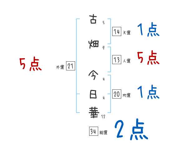 天運![]() | 古畑今日華さんの天運は14画の1つ星!人に対して優しいがストレスを溜め込みがち。人間関係のトラブルを避けるよう気をつけましょう。 家系が持つ宿命的な運勢を表します。祖先から受け継いだ苗字ですので自分の力が及びません。家柄を象徴します。 |