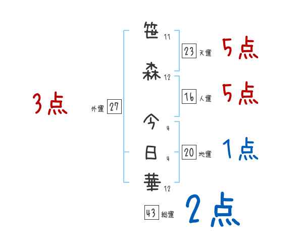 人運![]() | 笹森今日華さんの人運は16画の5つ星!人望が厚く大きく発展する。逆転成功が見える。 性格や才能などを表す2番目に重要な運勢です。人間関係や協調性、社会的な成功に影響します。主に20歳から50歳ぐらいまでの中年期の運勢を表します。 |