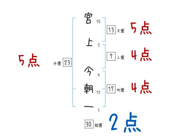 総運![]() | 宮上今朝一さんの総運は30画の2つ星!浮き沈みの激しさに注意しましょう。 あなたの人生を表す1番重要な運勢です。生涯を通じて影響する総合運となり、主に50歳以降の晩年期に影響を及ぼします。 |
