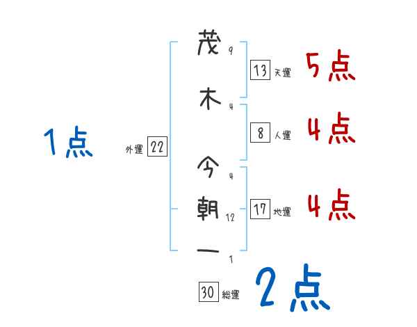 外運![]() | 茂木今朝一さんの外運は22画の1つ星!努力することが苦手ないっぽう手先が器用。芸術性にも優れる。 生活面を象徴する運勢です。外部から受ける影響力を表し、結婚運、家庭運や職場、環境への順応性を表します。 |